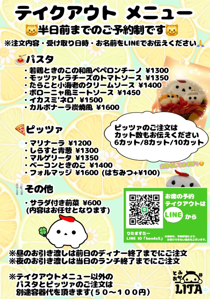 テイクアウトのご注文は、半営業日前までの事前予約制です。